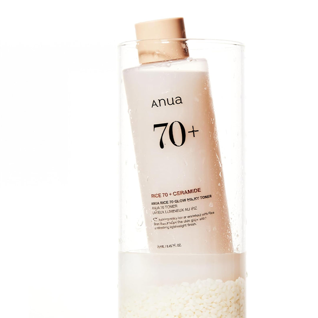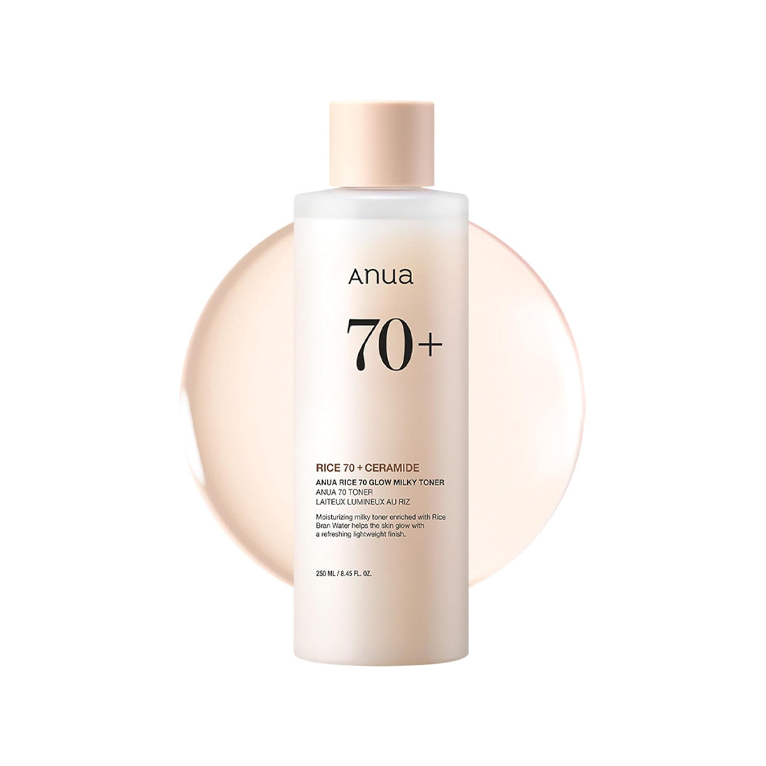 Anua Rice 70 Glow Milky Toner – maitinantis ir intensyviai drėkinantis veido tonikas, kurio pagrindą sudaro ryžių sėlenų vanduo. Formulė praturtinta niacinamidu, keramidais ir hialurono rūgštimi, kurie padeda drėkinti, šviesinti odą ir suteikti jai natūralaus švytėjimo. Tonikas padeda subalansuoti sebumo išsiskyrimą, o sudėtyje esantis betainas ramina odą ir saugo ją nuo sudirgimų.