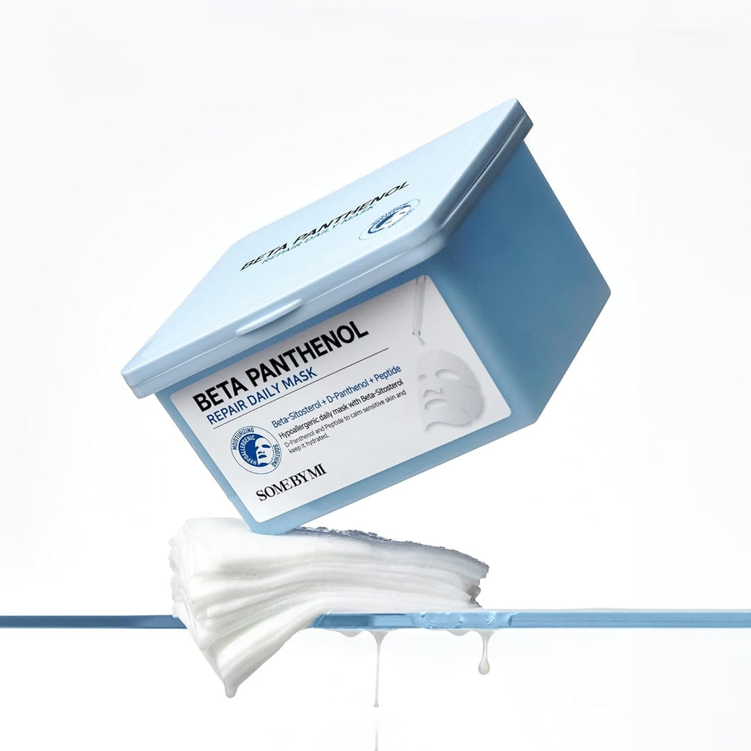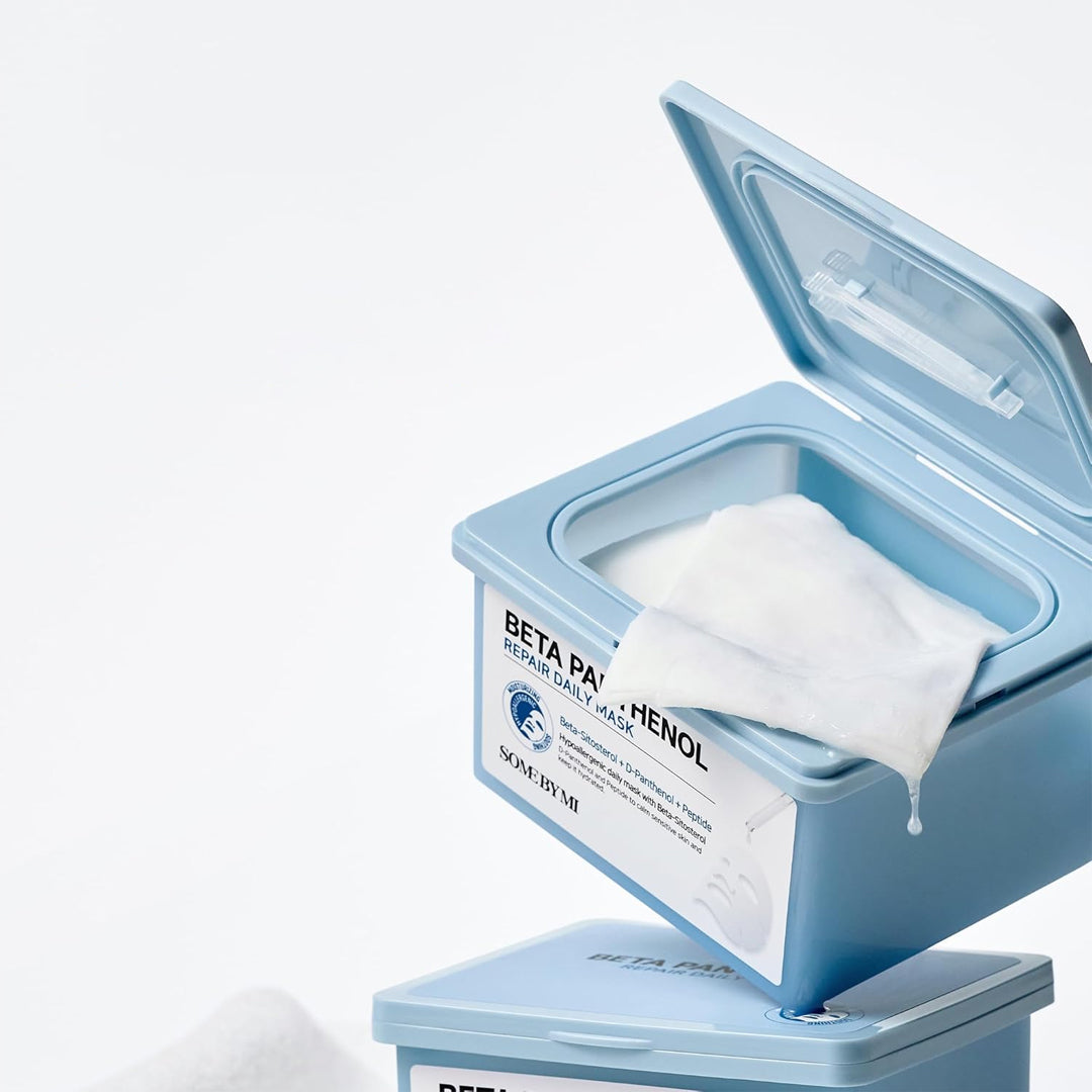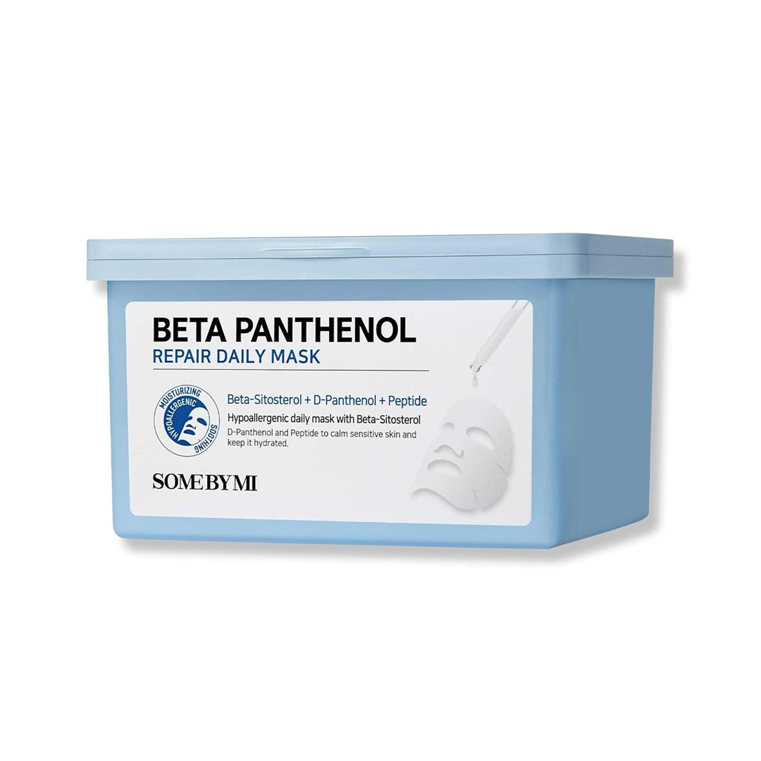 SOME BY MI Beta Panthenol Repair Daily Mask - lakštinės veido kaukės, skirtos jautrios, sudirgusios ir pažeistos odos raminimui, drėkinimui ir odos barjero atstatymui. Šios kaukės sukurtos kasdieniam naudojimui ir padeda palaikyti sveiką, subalansuotą bei komfortišką odos būklę. Formulė praturtinta Beta-sitosteroliu, D-pantenoliu (1 %) ir drėkinančiais peptidais, kurie stiprina odos barjerą, mažina jautrumą ir suteikia dvigubą – vidinį ir išorinį – drėkinimą. Kaukės padeda nuraminti odą po saulės, karščio ar aplinkos dirgiklių poveikio bei suteikia greitą palengvėjimo jausmą.