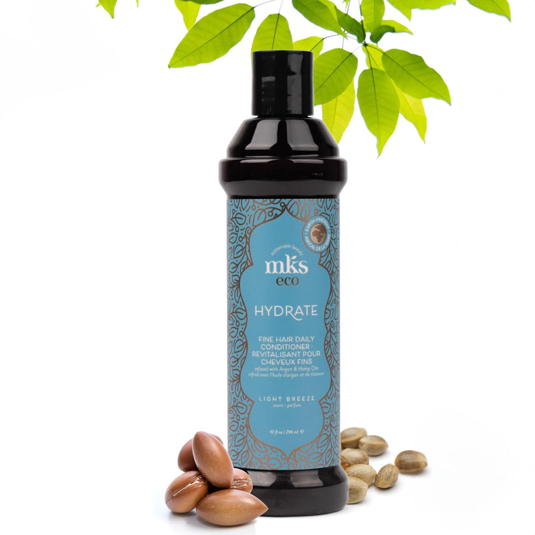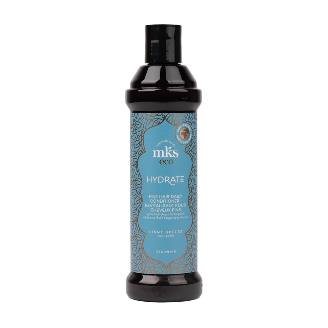 MKS ECO Hydrate – drėkinantis kondicionierius ploniems plaukams. Lengvos formulės kondicionierius su argano ir kanapių sėklų aliejais drėkina plaukus jų neapsunkindamas. Suteikia glotnumo, švelnumo ir natūralaus blizgesio, stiprina plauko žvynelius ir saugo nuo lūžinėjimo. Idealiai tinka ploniems, gležniems ir dažytiems plaukams. Kvapas – Light Breeze (bergamotė, kadagio uogos).